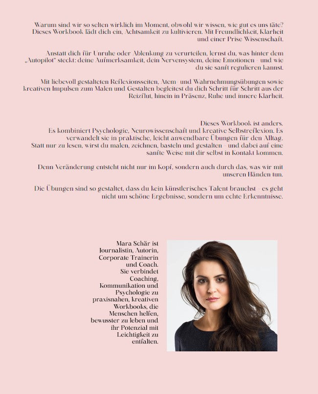 Ziel ist es, dir Schritt für Schritt zu mehr Präsenz, emotionaler Ausgeglichenheit und innerer Ruhe zu verhelfen. Mit klaren Übungen, Reflexionsfragen und Impulsen wirst du lernen, den Moment bewusster wahrzunehmen, Stress besser zu regulieren und dich selbst neu kennenzulernen.